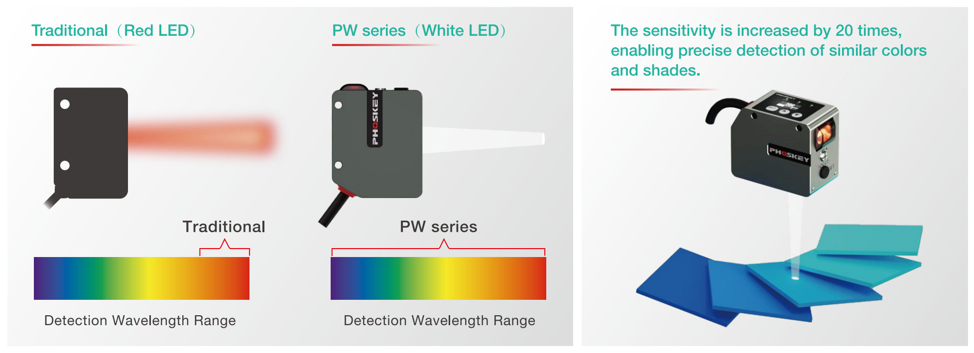 The traditional red LED photoelectric sensor can only detect the intensity difference of light and can only receive light in the red wavelength range. PW series adopts white LED light source, which can receive all wavelength ranges of visible light. It can be detected according to the appearance color of the detected object, so as to accurately detect the subtle color difference.