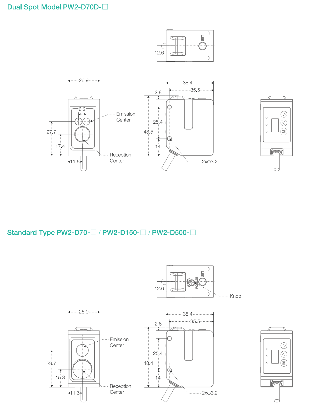 | Detection distance | 30 - 70 mm | 30 - 70 mm | 70 - 150 mm | 150 - 500 mm | Depends on connected fiber optic elements | |