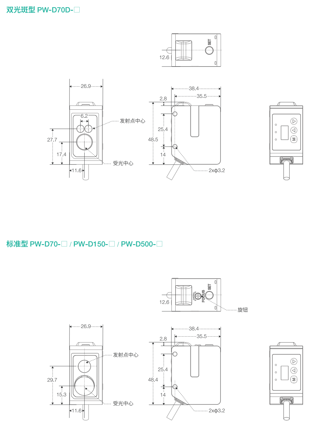 | 最小光点直径 | 50mm 时,约 2×4mm | 50mm 时,约 Φ7mm | 100mm 时,约 Φ4.5mm | 250mm 时,约 Φ11mm 500mm 时,约 Φ20mm |