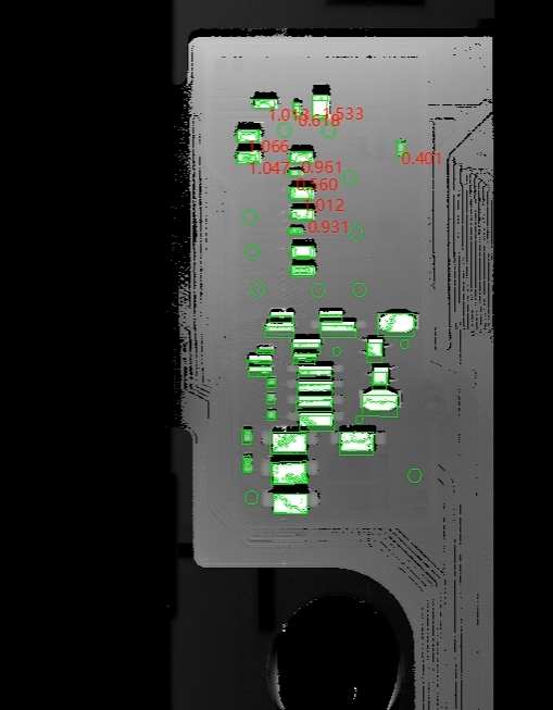 通过定位选定元器件测量区域,再拟合多点建立平面基准面,再进行高度差计算,计算测量位到基准面的高度差。(绿色标注区域为基准面,红色为元器件测量高度)